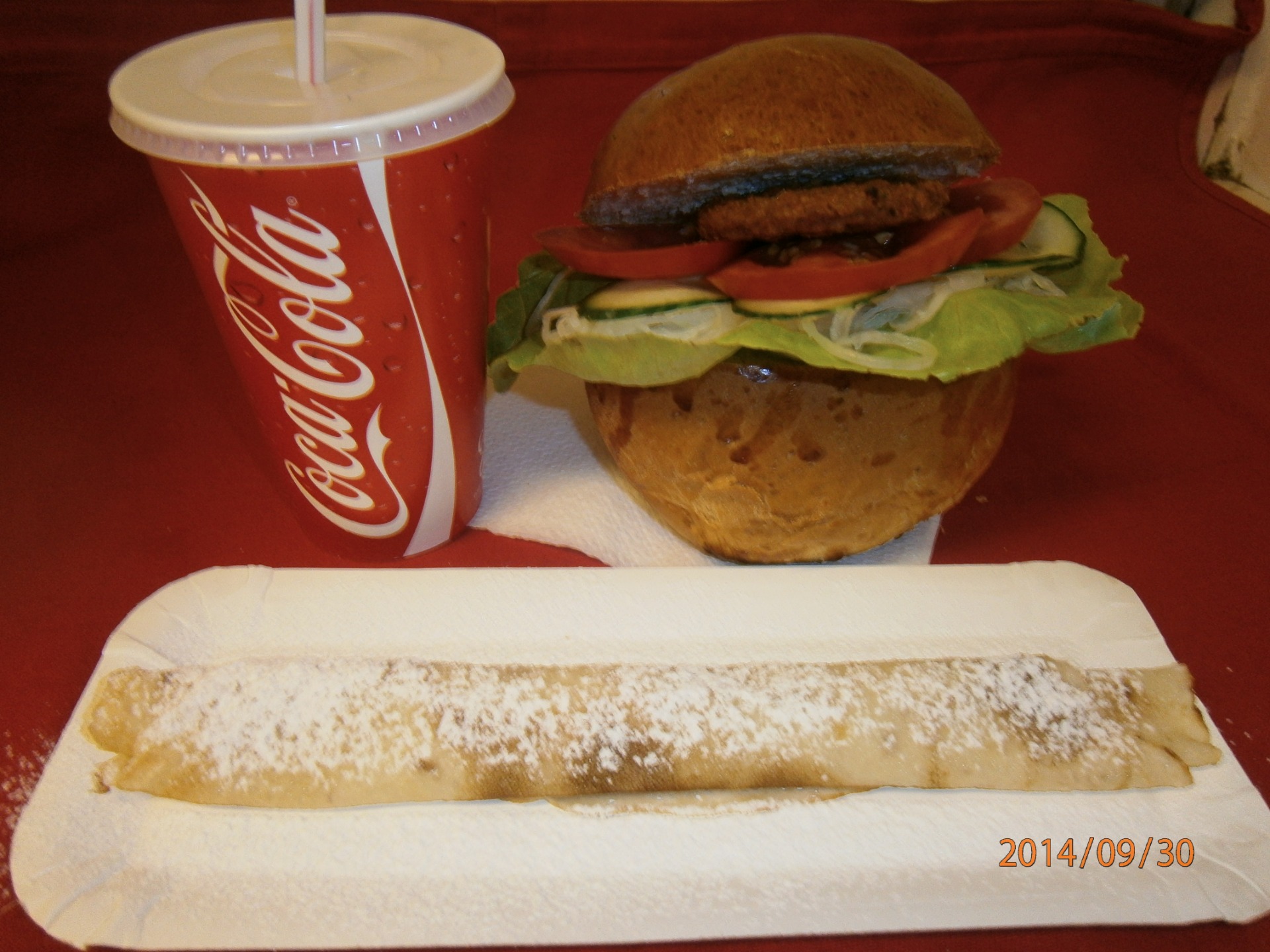 Hamburger, 3dl választható dobozos üdítő, 1db palacsinta.